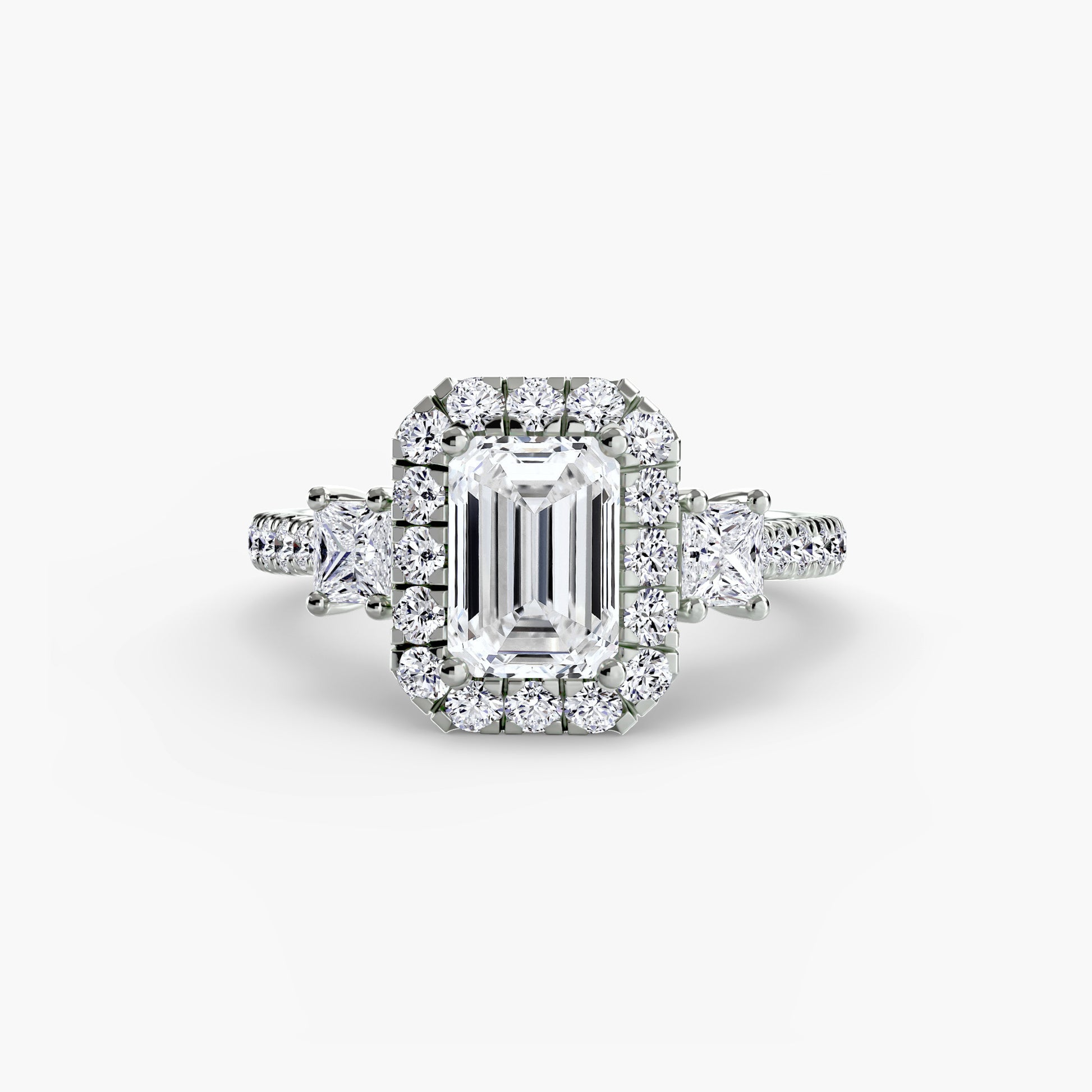 A unique take on the classic three-stone ring, this design is enhanced with a radiant halo for amplified brilliance and symbolism. Timeless with a modern twist.